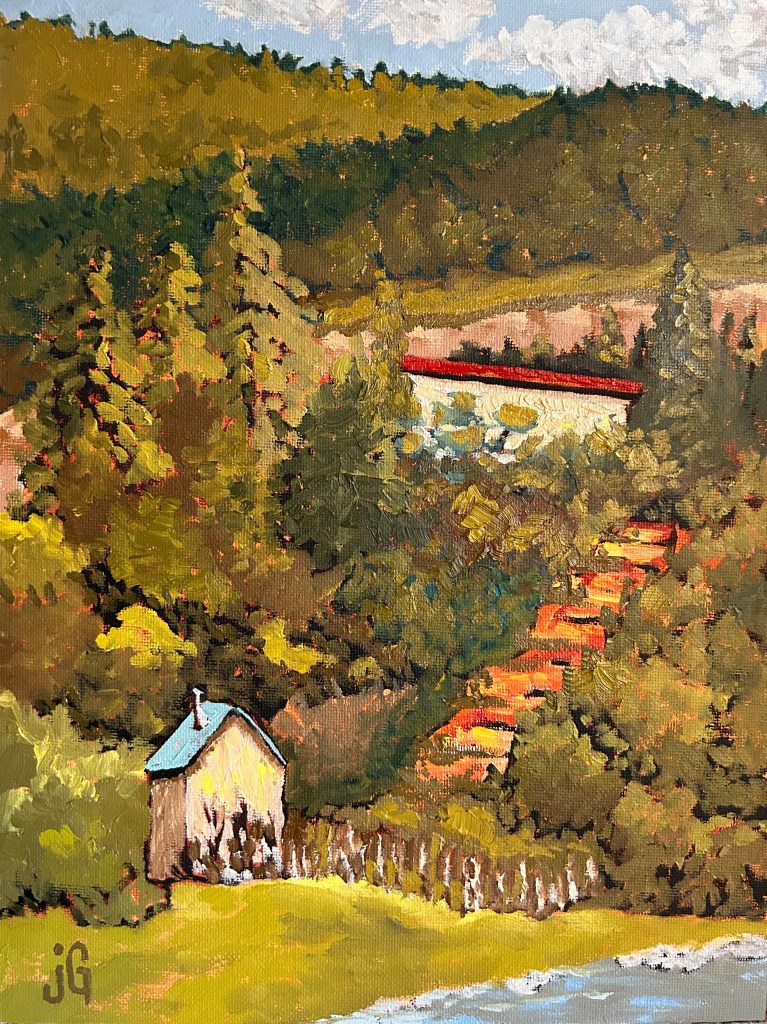 When my brain hurts from all the thinking involved to make a decent painting (perspective, value, composition, color, …), Go julieGogh means Fun … just play and let the paints speak for themselves. This one is in Taos – I wanted to capture this magical place – the vastness of the trees all the way up to the Big Sky – the quiet – the stream – the cute little (out)house with path up to the art studio where great things happen. I was trying to copy my favorite Van Gogh (modeled by my guest Ruby).