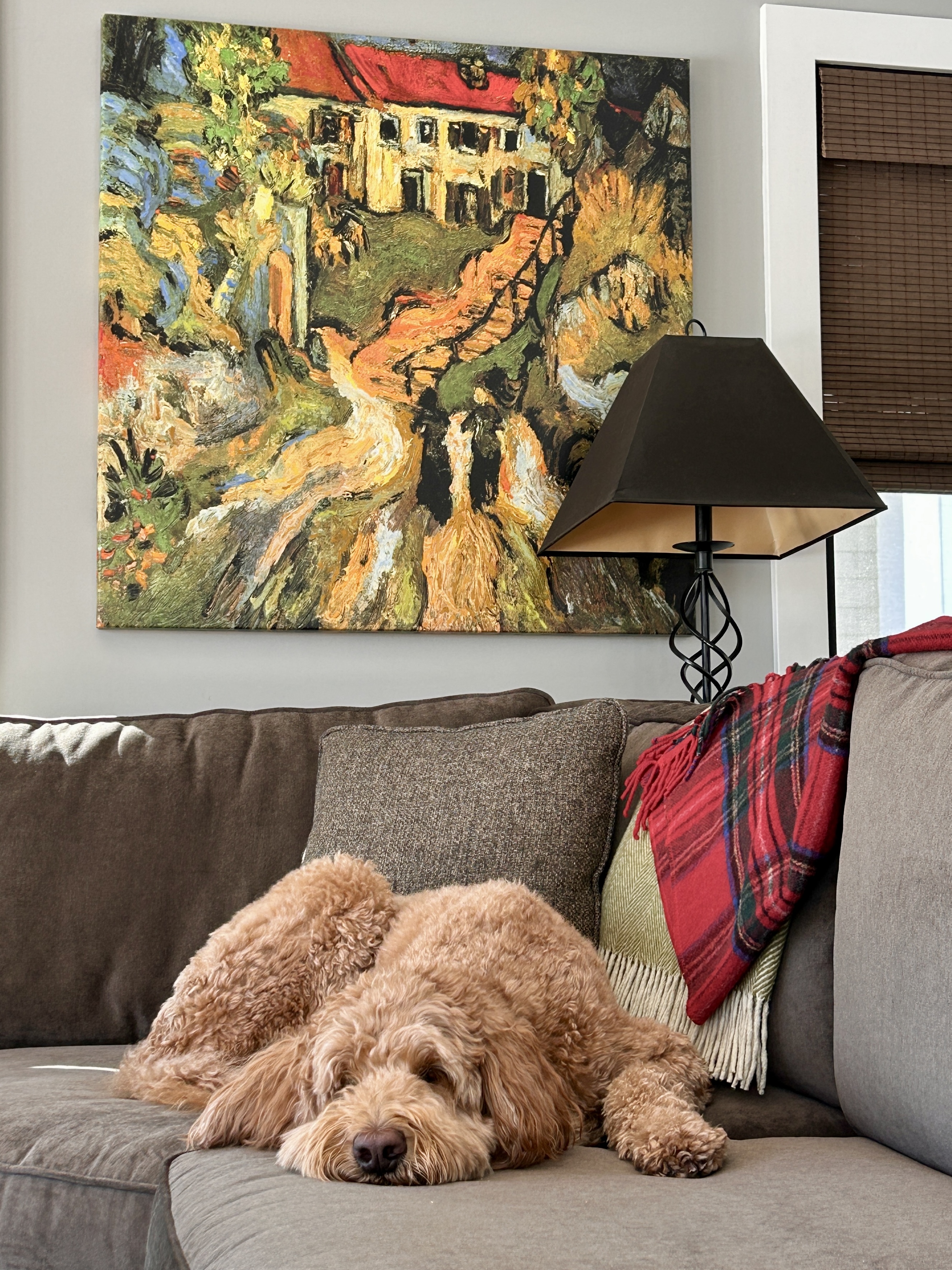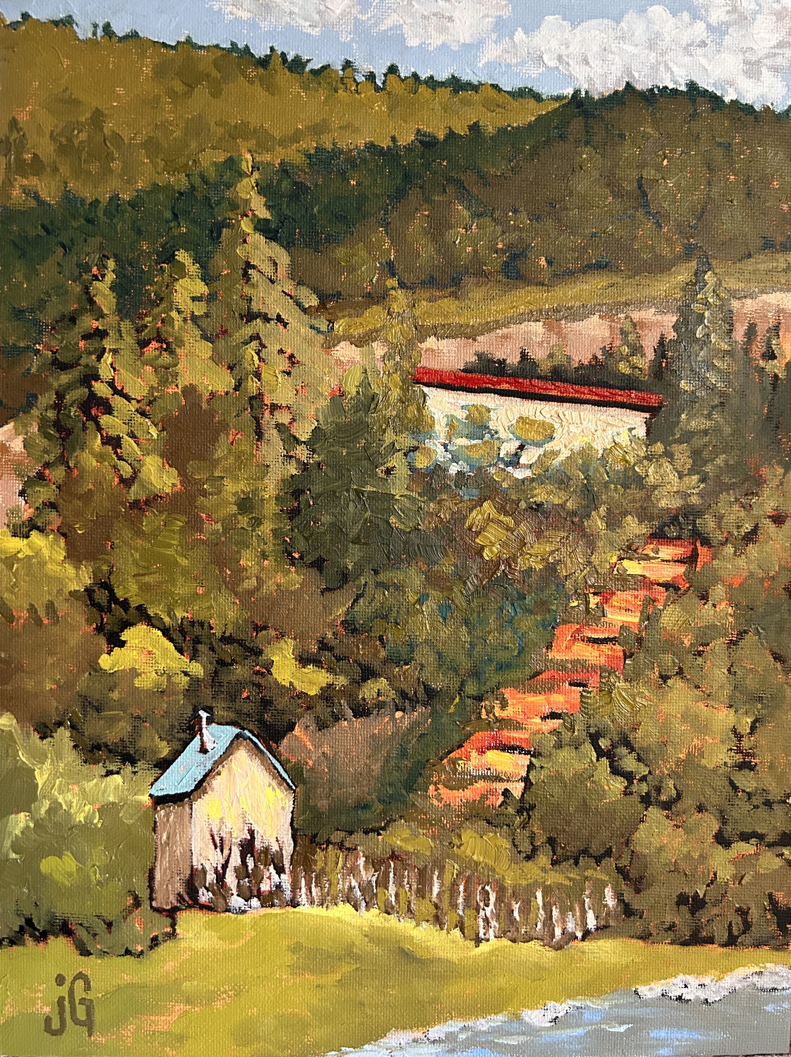 When my brain hurts from all the thinking involved to make a decent painting (perspective, value, composition, color, …), Go julieGogh means Fun … just play and let the paints speak for themselves. This one is in Taos – I wanted to capture this magical place – the vastness of the trees all the way up to the Big Sky – the quiet – the stream – the cute little (out)house with path up to the art studio where great things happen. I was trying to copy my favorite Van Gogh (modeled by my guest Ruby).